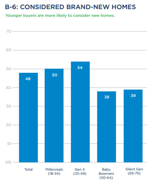 - Younger buyers (50 percent of Millennials and 54 percent of Generation X) are significantly more likely than Baby Boomers or the Silent Generation (38 percent and 39 percent, respectively) to consider newly built properties.