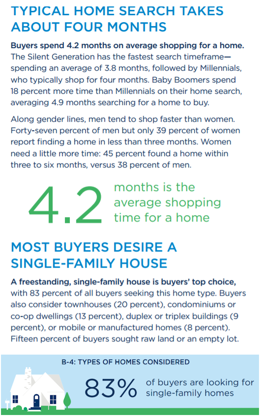 - Only 46 percent of buyers get the first home on which they make an offer, reflecting the reality that in today’s tight market, the search—which takes an average of 4.2 months— comes with competition and disappointment.