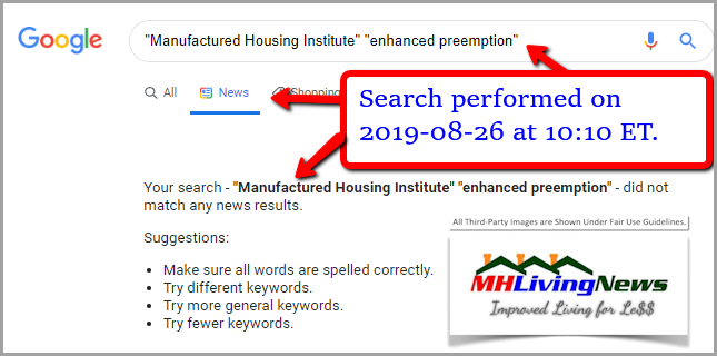 By contrast, on this date, there is no result whatsoever on the Manufactured Housing Institute (MHI) website for the search terms “enhanced preemption.” Yet, they claim to represent all segments, production and post-production, of federally regulated manufactured housing. Why that stark difference? Who benefits, and who are harmed, by that failure to robustly promote this key legal principle?