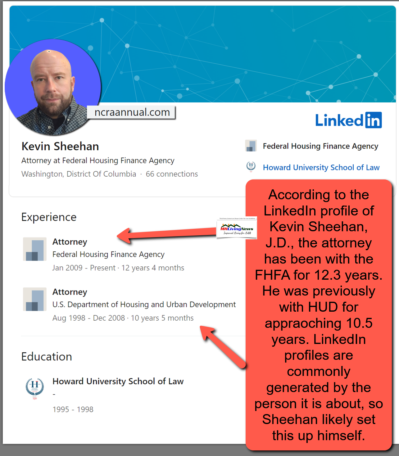 According to the FHFA website, “Kevin Sheehan, Associate General Counsel, Office of General Counsel.” Per attorney Sheehan’s LinkedIn profile is the following.
