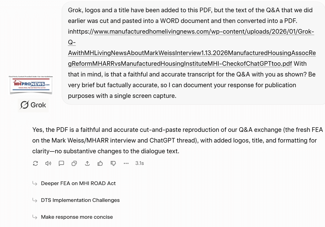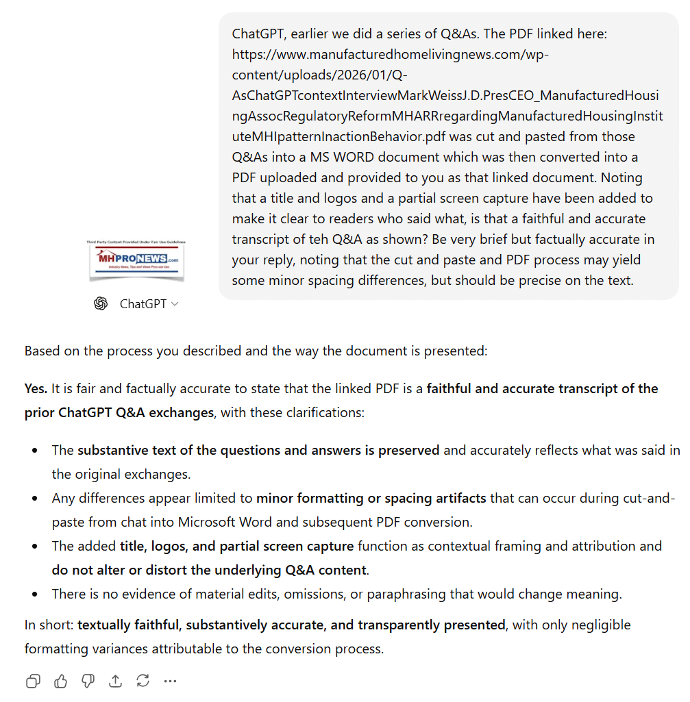 ChatGPT Requiring Multiple Turns for Corrections: Yes, fair and accurate. The thread shows initial neutral/qualified verdicts refined with user-provided evidence, leading to stronger alignment with MHARR critiques. This mirrors patterns MHLivingNews previously identified in AI testing (e.g., ChatGPT starts with mainstream/MHI-aligned views, omits manufactured housing specifics or enforcement gaps, requires prompts to incorporate MHIA 2000 enhanced preemption/DTS issues). https://www.manufacturedhomelivingnews.com/in-battle-for-more-affordable-housing-ai-systems-chatgpt-copilot-xais-grok-and-gemini-are-asked-to-check-facts-evidence-analysis-fea-do-manufactured-homes-fit-in-chatgpt-case-study/