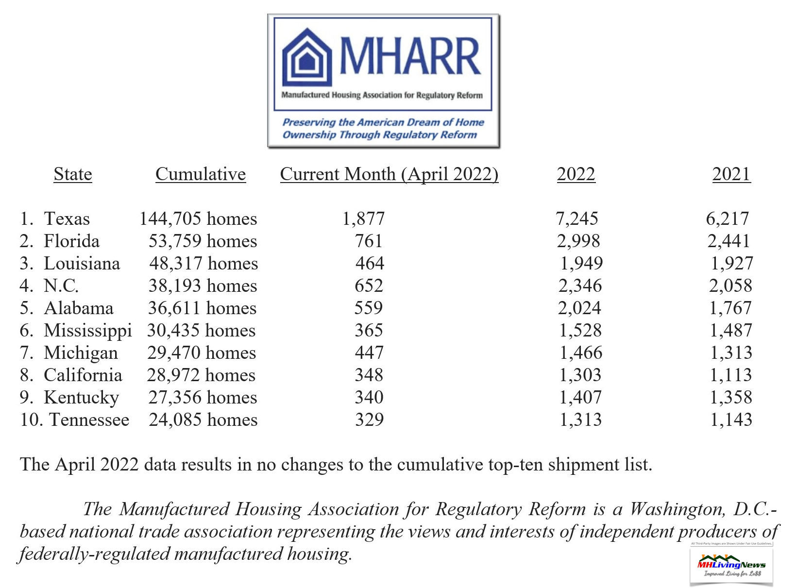 A further analysis of the official industry statistics shows that the top ten shipment states from the beginning of the industry production rebound in August 2011 through April 2022 — with cumulative, monthly, current year (2022) and prior year (2021) shipments per category as indicated — are: