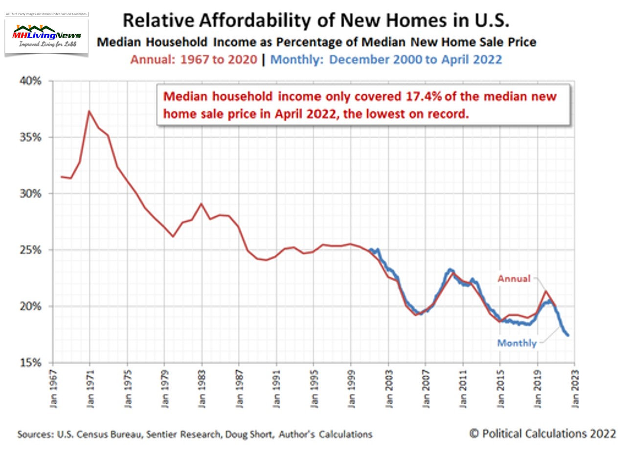 April 2022’s median household income was just 17.4% of the value of the median new home sold during the month. By this raw measure, new homes have never been less affordable for the period where we have data available.