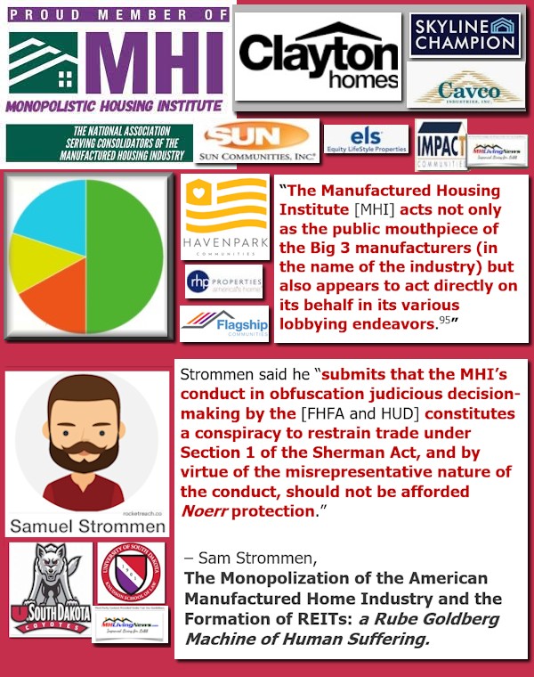 In doing so, they may point the finger at the Manufactured Housing Institute (MHI). MHI is said to be little more than a de facto arm of Clayton and allied dominating brands in the manufactured housing industry (a.k.a. “MHVille”) who aim to consolidate the industry into ever fewer hands.