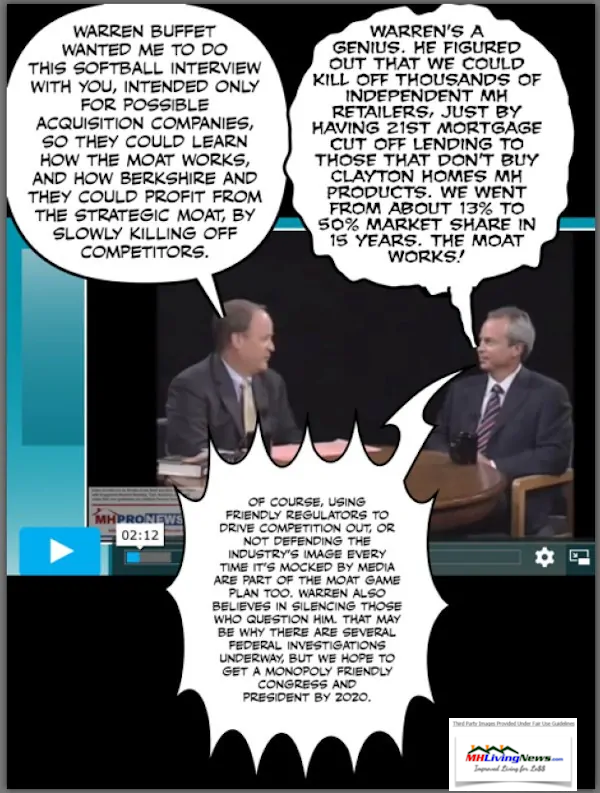 But this collection of linked articles, reports, and expert editorial commentary in this post – plus others found on our sites – constitute what is apparently the largest known collection anywhere online for information about Clayton Homes, their realities behind their “moat” corporate culture, and how this plays out with consumers, competitors, nonprofits, politics, and beyond.