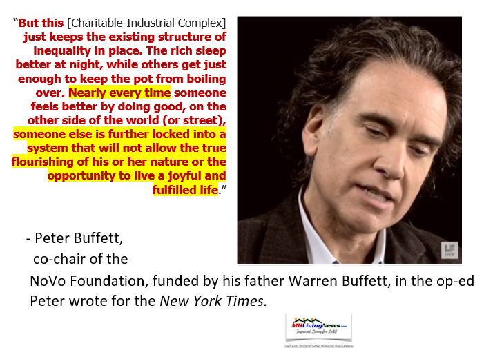 Donations and nonprofits have been used to give the illusion of goodness to Buffett and his brands. But when the facts are carefully examined, while certain individuals may benefit, his nonprofits and that of others like his tend to do little overall to change the problems they claim to want to solve. Who says? His own son, Peter Buffett, among others.
