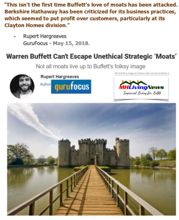 The “moat” or ‘a castle and the moat’ are important to understanding what has been occurring in manufactured housing since Buffett led Berkshire Hathaway made its first obvious play into manufactured housing in 2002. In 2003, Berkshire acquired Kevin Clayton led Clayton Homes. These are not matters of mere speculation, because direct quotes from Clayton and Buffett make it plain just how important the moat principle is for their business model and thus their ‘corporate culture.’
