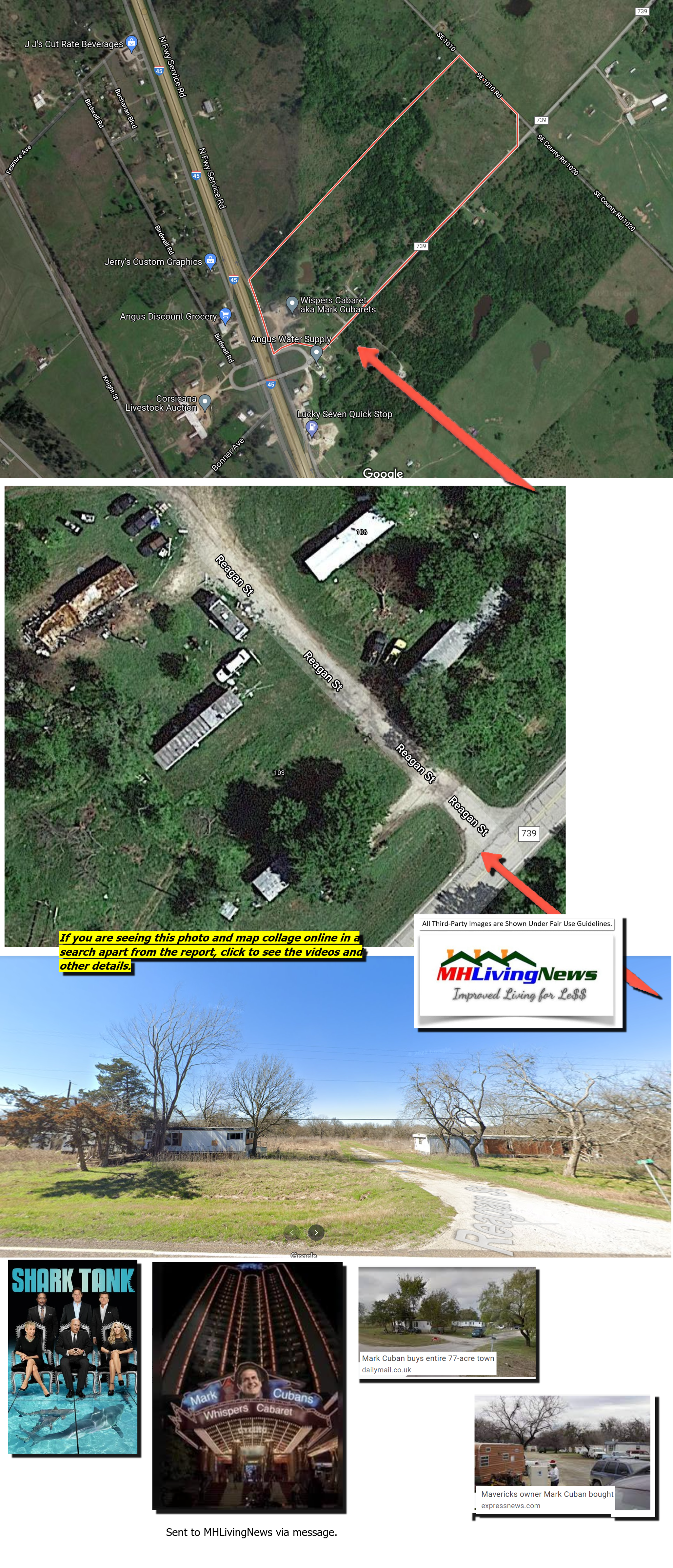 “Dallas Mavericks owner Mark Cuban purchased an entire, tiny — and virtually empty — Texas town. An abandoned strip club and vacant mobile home park are about all that’s still standing in the 76.8-acre community of Mustang, which is about 65 miles south of American Airlines Center, home of Cuban’s NBA franchise.” So said NBC News on 12.3.2021. KXAN said: “It’s estimated the town [of Mustang, TX] has about two dozen residents, and the only businesses there are a mobile home park and a strip club.” Well, perhaps not quite. NBC disputes that by saying that “it’s been several years since the last two businesses operated, W[h]ispers Cabaret strip club and Lion’s Den adult bookstore.” If NBC’s report is correct, the manufactured home community and town have no residents. “Did it to help out a friend. No plans yet!” Cuban said in an email to NBC News on Friday. Cuban is one of the longtime co-hosts of CNBC’s “Shark Tank.”