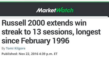 “The Russell 2000 Index RUT, +0.92% rose 0.9% Tuesday to a record high, as the small-cap tracker’s win streak hit the longest stretch in over 20 years. After closing at a four-month low on Nov. 3, the index has now gained ground for 13-straight sessions, soaring 15% during that streak.”