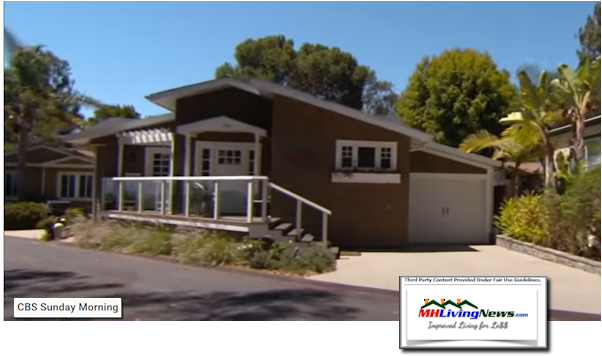 The video above from CBS Sunday morning shows film clips that reflect the old trailer houses, which evolved into mobile homes, and finally into manufactured homes. The reporter in the video is incorrect in using the term “mobile home” (or by too many, ‘trailer house’) in that video. The home above and several in their report are “manufactured homes,” not ‘mobile homes.’ That correction noted, overall their video does a good job of debunking several mistaken ideas. For instance, even millionaires and some billionaires own a modern manufactured home. CBS shows several interior shots of attractive manufactured homes overlooking the ocean in an exclusive high-end neighborhood that has been home to several entertainers and stars of various kinds.