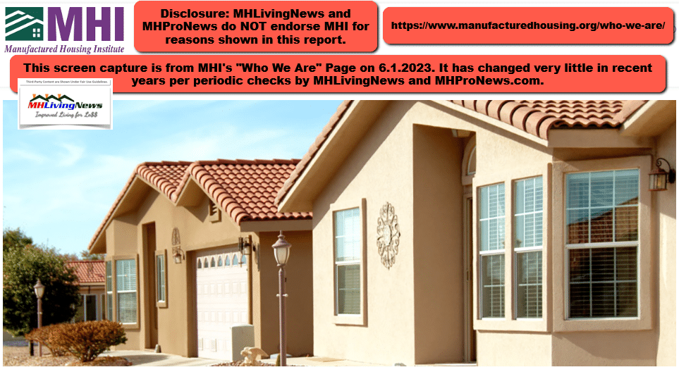 That is a fair question. Because there are several multi-billion-dollar sized firms that are involved in manufactured housing. Furthermore, educational, marketing, and non-production related issues fall under the umbrella of the Manufactured Housing Institute (MHI), which bill itself as representing “all segments” of manufactured housing. Per MHI’s About Us page on this date (6.1.2023) are the following claims, which will be examined further below.