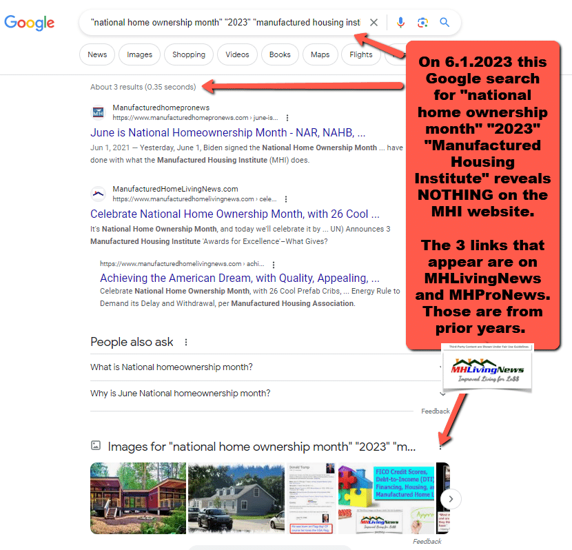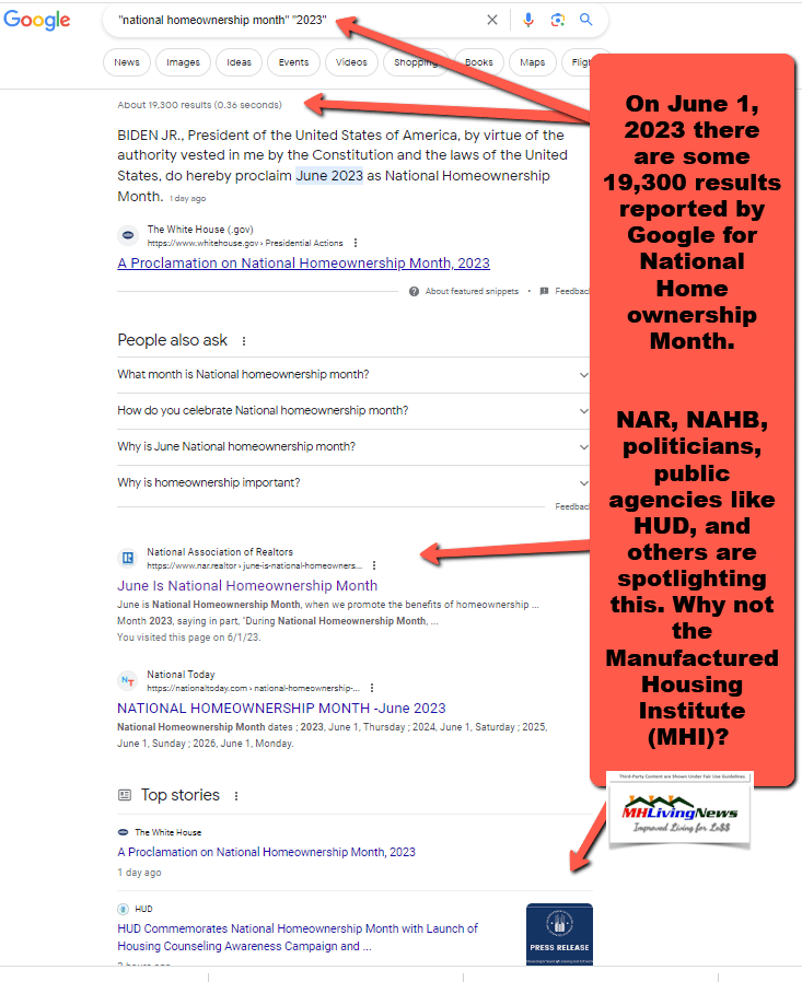 It is June 1st, in national home ownership month. A check of MHI’s home page reveals no apparent reference to it. A check of MHI’s social media pages earlier this morning reveals nothing on the topic. MHProNews has reported on this problematic pattern by MHI previously. By contrast, the National Association of Home Builders (NAHB) and the National Association of Realtors (NAR) each have posts, social media, and other articles that focus on promoting their part of the U.S. housing industry during national home ownership month. The first article linked below is from 2021. So, this year’s apparent miss by MHI is not the first time. Rather, it is apparently part of a pattern.