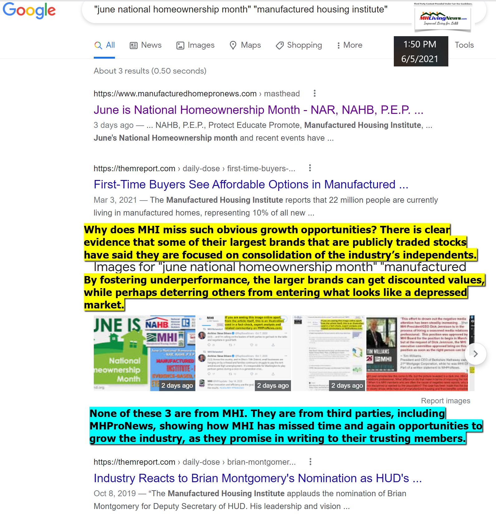 Let’s simply point to what previously referenced research reports by independent third parties have said. Read each of those if you are really curious about why the industry is so misunderstood. Understand that as odd as it may sound, MHI – to pick but one example – is demonstrably not properly promoting the truth about manufactured homes and manufactured home living. Do they say nice things? Sure. But they miss far more opportunities than they hit. As Exhibit A to illustrate today that claim is the fact that MHI has not – per the Google search below – promoted manufactured housing as a consideration for June and National Homeownership Month.