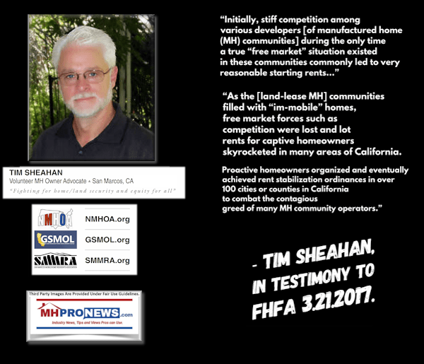 It is worth noting that facts and relative items that resident may mistakenly think has nothing to do with their situation may in fact apply. For instance. When Berkshire-owned Clayton Homes began gobbling up pieces of the industry, that had ripple effects that impacted manufactured home community residents. As resident advocate Tim Sheahan observed, there was a time when the free market was working in manufactured housing. But when the free market was upended, a cascade of consequences have taken place.