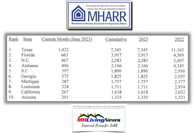 MHARR=ManufacturedHousingAssocForRegulatoryReformLOGO-ManufacturedHomeShipmentsTop10States2023vs2022June2023-ManufacturedHomeLivingNewsMHLivingNews