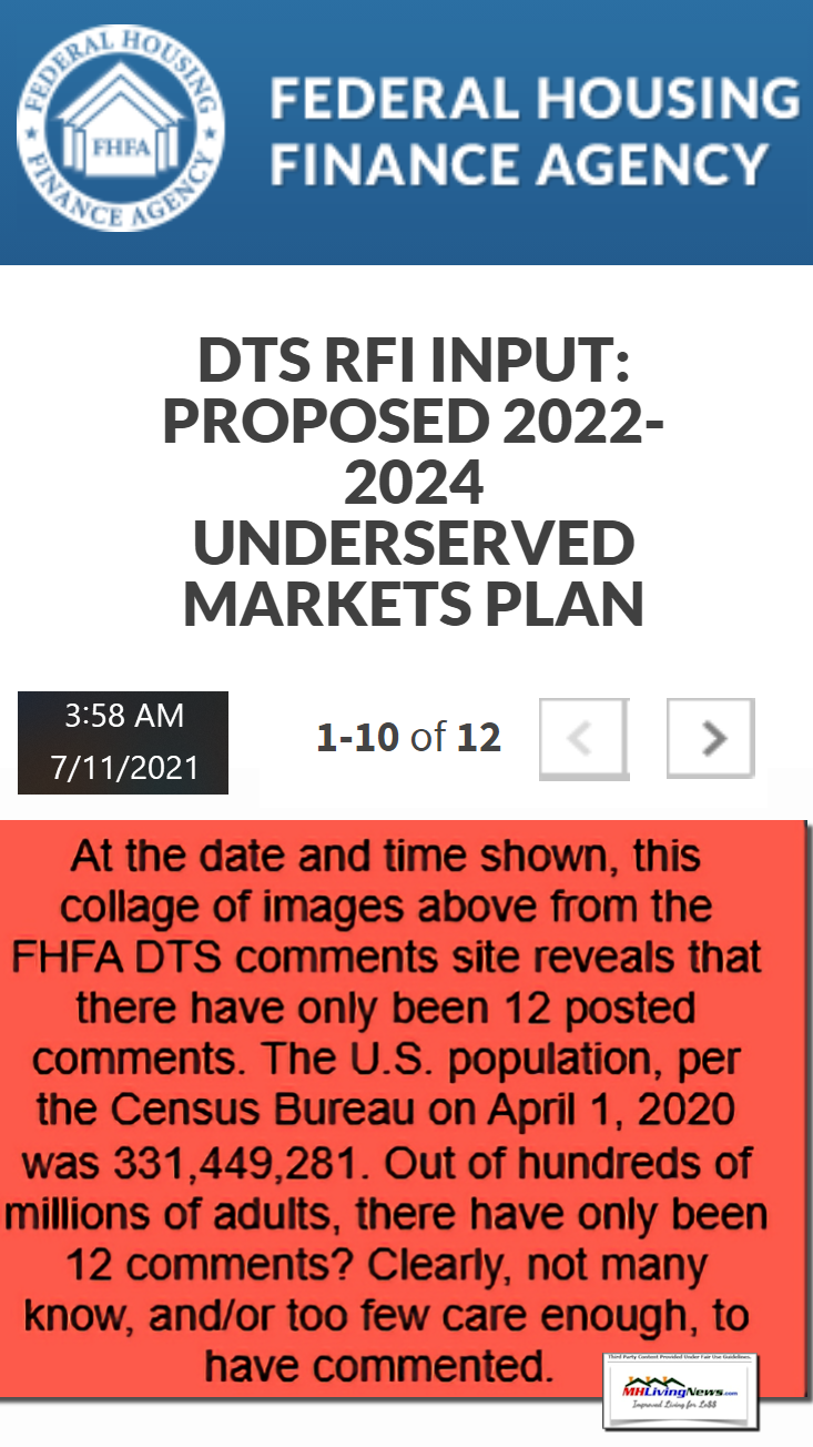 Note that while it is useful – in fact, encouraged! – that you make emailed or online/electronically posted comments that urge the FHFA to enforce existing laws. As of 3:58 AM ET, out of hundreds of millions of adult Americans, there are currently only 12 – one dozen – posted comments on the FHFA website on this topic.