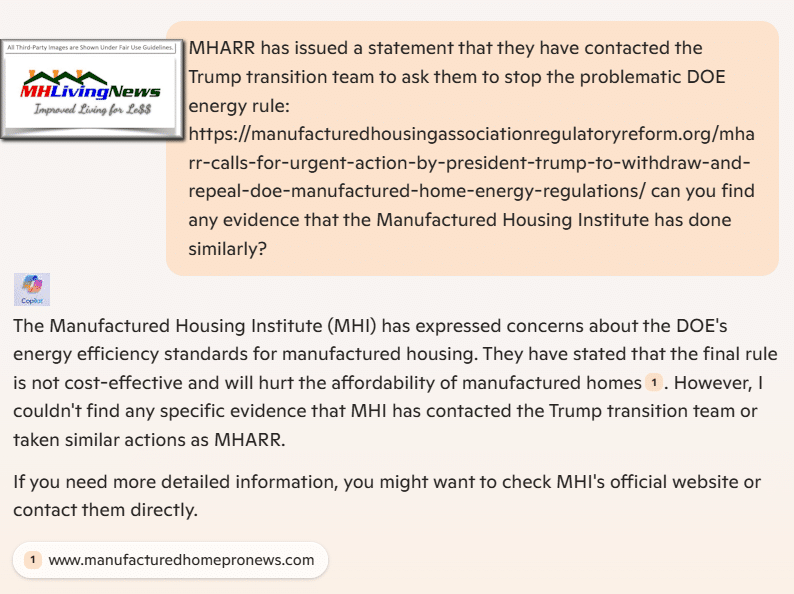 6) What is inescapable is that the energy rule proposed is based upon a flawed premise. Conventional housing standards don’t work for homes that are built in a factory to performance standards. MHI has admitted as much. But that begs questions, such as, why didn’t they issue a letter to the Trump Transition team like MHARR has done? If MHI have done so, there is no known evidence for that move. To illustrate, consider the following Q&A with left-leaning Bing’s AI powered Copilot.