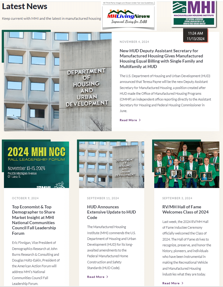 2) The Manufactured Housing Institute (MHI) on this data (11.13.2024) at about 11:25 AM ET has no apparent news articles on the topic of the pending DOE manufactured housing energy rule. Nor is there any other apparent mention of the 2024 election outcome, as there is from the MHARR website.