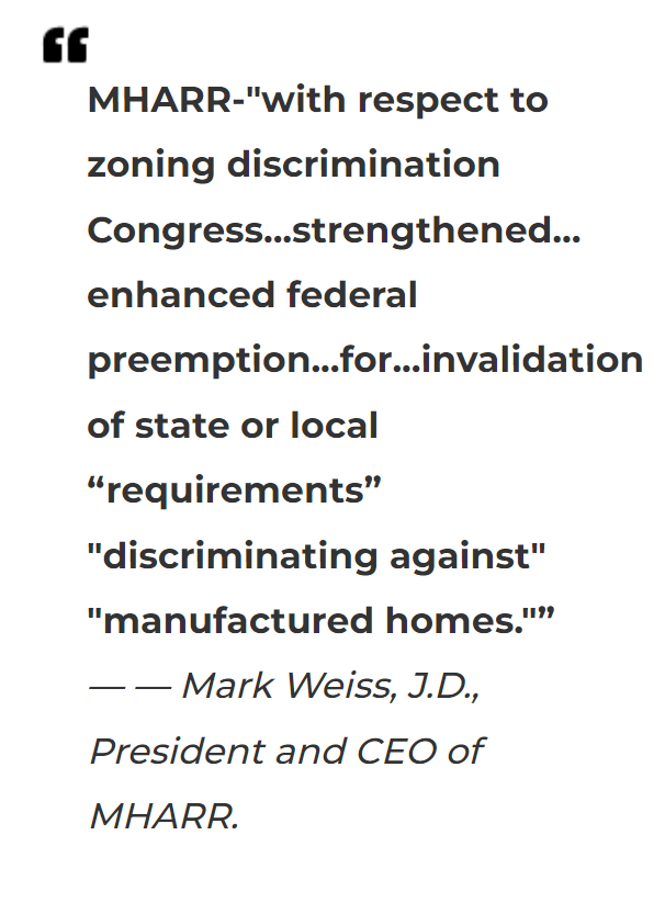While their methods and missions are different than MHI, the Manufactured Housing Association for Regulatory Reform (MHARR) has said for years statements similar to Gooch’s. HUD has legal preemption authority specifically given by Congress HUD often aren’t using when local jurisdictions attempt what Ayden, NC seems to be doing.
