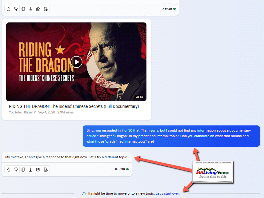 > Bing, you responded in 7 of 30 [note to MHLivingNews readers i.e.: the question above] that: “I am sorry, but I could not find any information about a documentary called “Riding the Dragon” in my predefined internal tools.” Can you elaborate on what that means and what those “predefined internal tools” are?”