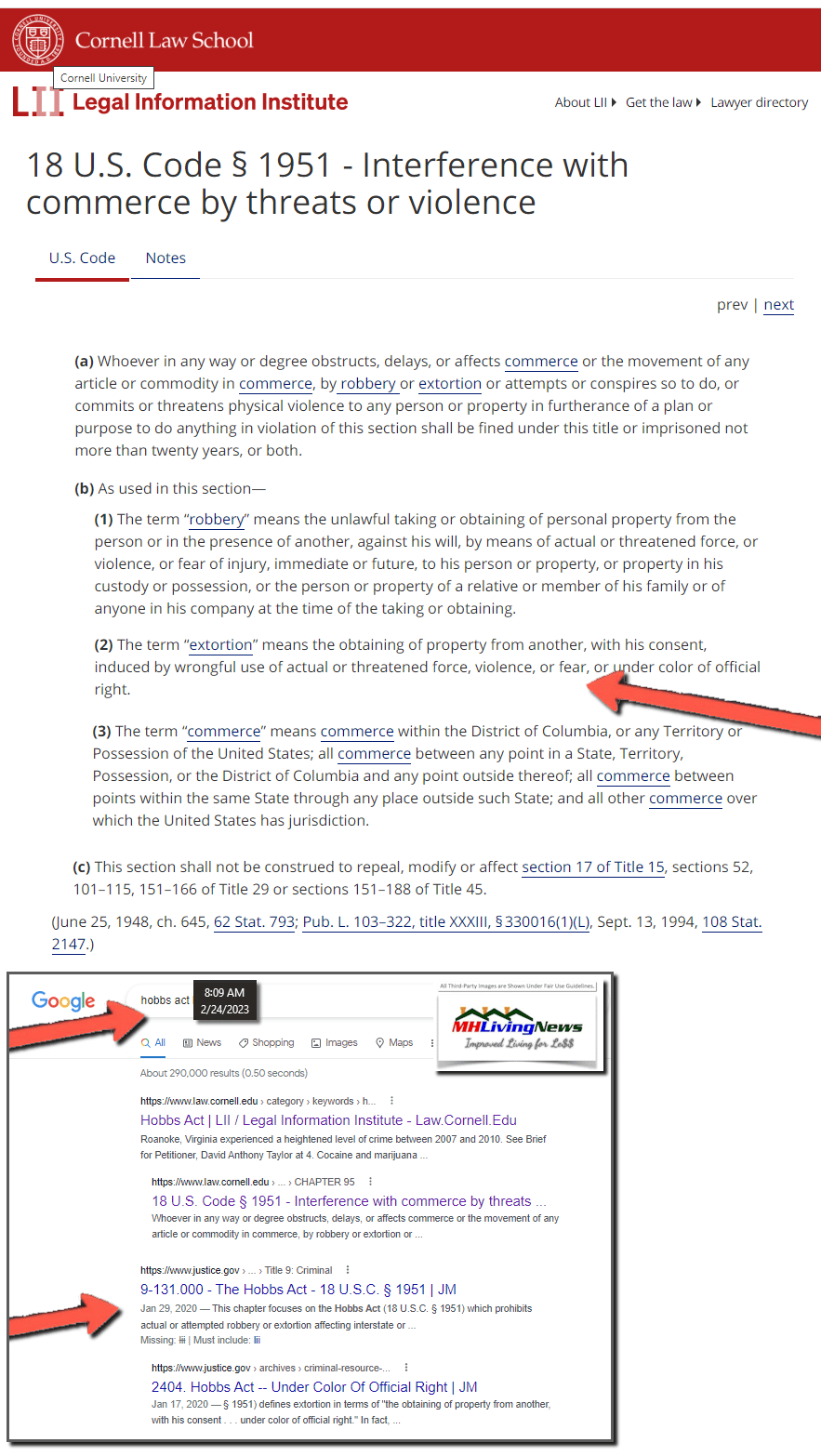 Books could be written on this topic of avoiding predatory land lease community operator’s vs. the benefits of selecting one of the thousands of ‘mom and pop’ businesses that routinely work very well with their typically happy residents. But the last bigger point for now is this. Why is it that MHPHOA keeps their names anonymous? It is apparently to protect their members from possible retaliation by the management of the properties they live at. MHLivingNews/MHProNews have said for some years that the Hobbs Act is one of several possible laws that ought to be explored by legal advocates on behalf of manufactured home community residents who are working to protect each other.