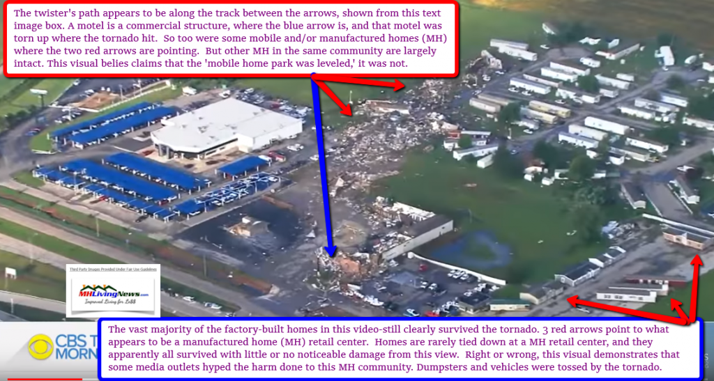 Note that the CBS News video above doesn’t say that the tornado “leveled” the manufactured home community. While individual homes were smashed or rolled, but that occurred in nearby commercial buildings too.