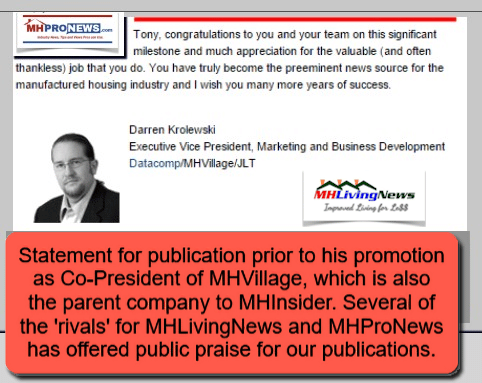 See the videos, linked reports, and surf the site for more information about the horrors, hopes, and halleluiahs found in MHVille. If you do so prudently, and translate these insights into your own scenario, then you may find your personal journey in manufactured home living to be a more satisfying and rewarding one. ###