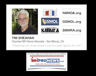 Note that while Sheahan was living in San Marcos, CA when he made these comments to the FHFA in testimony dated 3.21.2017, that pattern he described arguably exists in other parts of the U.S. too. Indeed, Sheahan has served as the National Manufactured Home Owners Association (NMHOA) elected volunteer president, and also on two other manufactured home community nonprofit groups. They are the Golden State Manufactured-Home Owners League (GSMOL) and the San Marcos Mobilehome Residents Association (SMMRA).