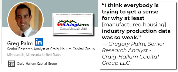 ![GregoryPalmCraigHallumAnalystQuoteToBillBoor“I-think-everybody-is-trying-to-get-a-sense-for-why-at-least-[manufactured housing] industry production data was so weak.” MHLivingNews](http://www.manufacturedhomelivingnews.com/wp-content/uploads/2023/06/GregoryPalmCraigHallumAnalystQuoteToBillBoorI-think-everybody-is-trying-to-get-a-sense-for-why-at-least-manufactured-housing-industry-production-data-was-so-weak.-MHLivingNews.png)