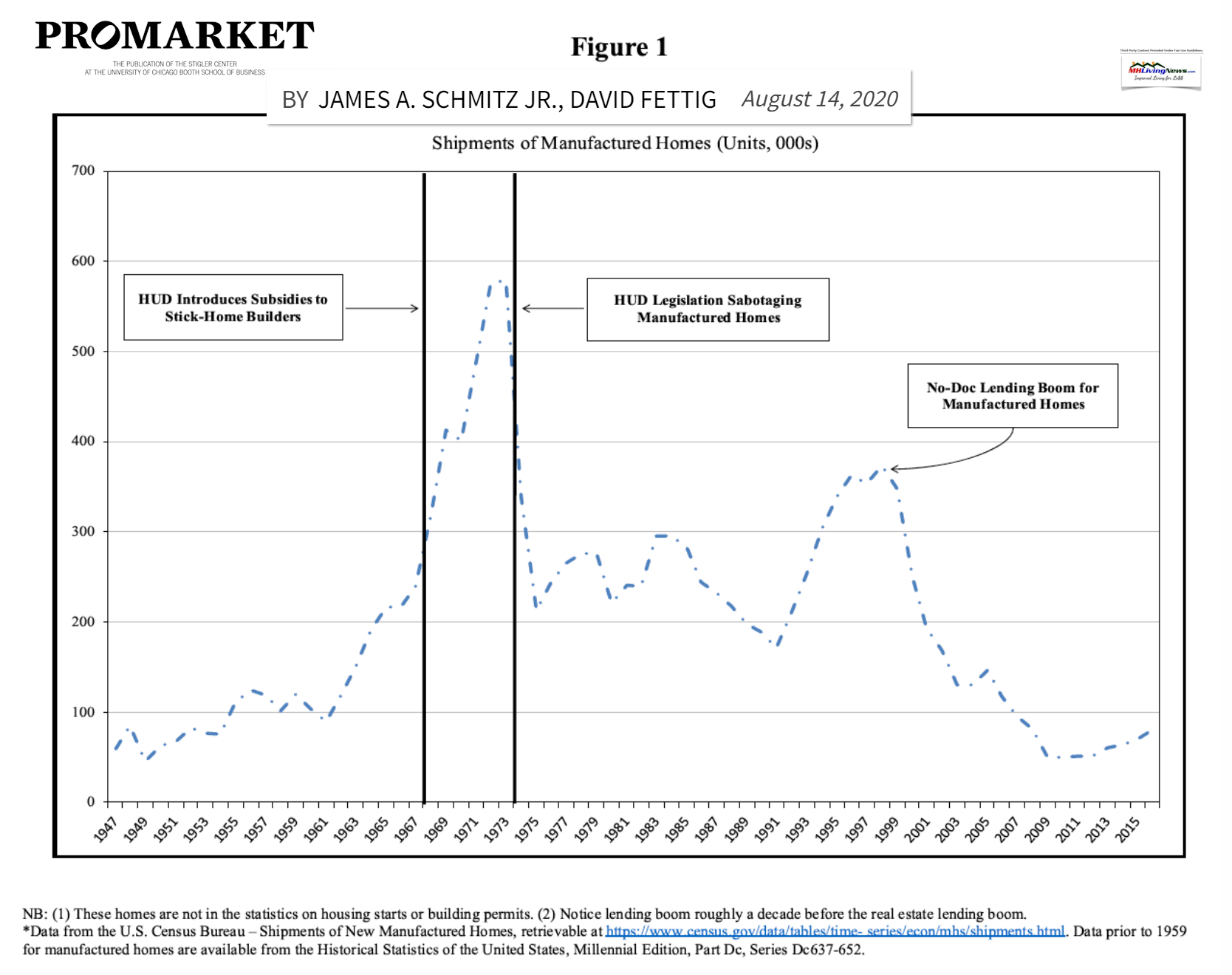 L) Minneapolis Federal Reserve researchers have alleged that HUD and builders are “sabotaging” manufactured housing as part of a monopolistic ploy. James A. “Jim” Schmitz and his colleagues came at this differently than Samuel “Sam” Strommen with Knudson Law. Strommen called what is occurring in manufactured housing a “Rube Goldberg Machine of Human Suffering.” Both Schmitz and his colleagues are cited in the report linked below that has Strommen’s entire heavily footnoted thesis. Strommen says this is a case of “felony” monopolization conspiracy, and specifically said MHI is part of the conspiracy.