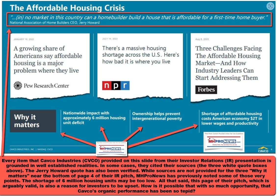 > “MHLivingNews and MHProNews has explored some insights based upon a slide from the Cavco Industries investor relations page that states that the lack of enough affordable housing costs the U.S. economy about $2 trillion dollars in reduced GDP annually. That page from Cavco’s IR pitch deck also makes the point that affordable home ownership can lead to more generational wealth creation. Can you shed light on the themes and importance of that particular item and related analysis?”