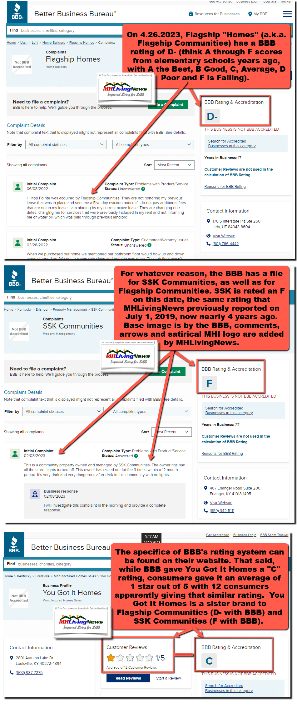 It is important to note as a preface to this shocking report that there are scores of honorable companies that operate in the manufactured housing industry. For that reason, this fact- and evidence-supported MHLivingNews editorial report ought to be disturbing to honorable manufactured home professionals, to current and prospective manufactured home buyers, residents, and customers seeking the affordable quality lifestyle manufactured home living can provide when done properly. That said, Better Business Bureau (BBB) D- rated Flagship Communities Real Estate Investment Trust (TSX:MHC.U) (TSX:MHC.UN) has announced they have been given three (3) Manufactured Housing Institute (MHI) “awards” for “excellence.” It is evidence of either incompetence, cronyism, or a scandalous scam on the part of those involved in the MHI awards process. Since these MHI “awards” may be used by Flagship or their related YouGotItHomes sister company to ensnare unsuspecting and trusting consumers, it merits swift public exposure and investigation. Any honorable business or professional ought to reject the notion that a firm with a poor reputation for dealing with their own resident/customers is the opposite of the principle that former MHI president and CEO Chris Stinebert said, quoted here. It is problems like this which caused a longtime MHI member to lament that the organization has been taken over by greedy expletive deleted individuals. That noted, what this report, analysis and editorial commentary will arguably underscore vindicates several reports previously published by MHLivingNews, our MHProNews sister site on both the problems at MHI in the 21st century while illustrating that Flagship’s business practices are still seemingly similar to how the firm operated under its prior name, SSK Communities, as was evidenced in the previous mainstream and trade news reports linked below.