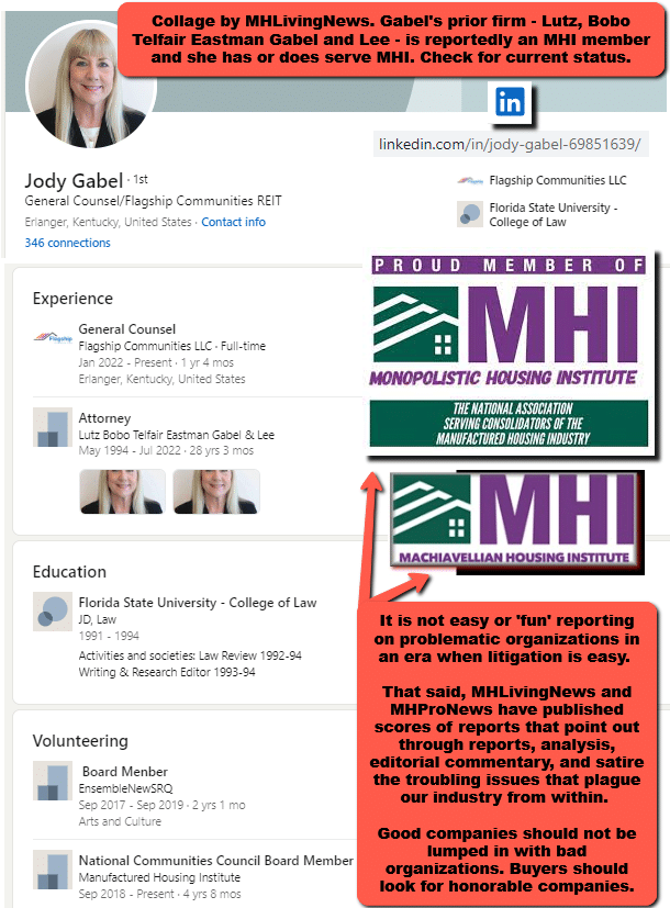 On this date, attorney Jody Gabel’s LinkedIn profile lists her as “General Counsel – Flagship Communities LLC.” Our MHProNews sister site ran the following report that referred to Gabel and MHI.