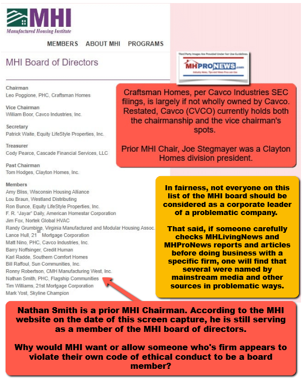 - 4) That’s not merely rhetorical. MHProNews did a report on MHI and their so called Code of Ethical Conduct. This troubling case being reported herein is but one more example of how MHI appears to ignore their own code of conduct, but actually rewards (awards) those who have a demonstrated pattern of poor business practices.