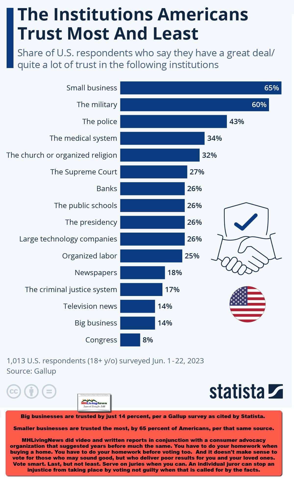 There are problematic companies in the manufactured housing industry. MHLivingNews has reported on those for years (just search the site to learn more). Generally speaking, it can often be in a homebuyers’ interest to do business with a smaller, independent producer and an independent businessperson. That also happens to be what Statista said in a recent survey of who is more or less trusted in America today.