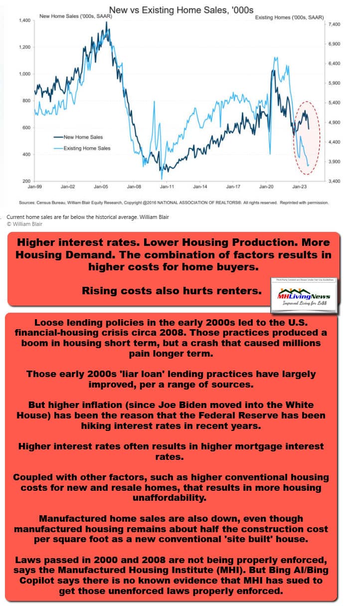 - They quoted William Blair macro analyst Richard de Chazal in a note published Friday: “[T]his spike in [interest] rates has had a marked impact in other areas, including causing a sharp deterioration in housing affordability to its lowest level since 1985 and dramatically lowering the supply of existing homes for sale in the market.” The graphic below was cited. The call out box is by Mobile and Manufactured Home Living News (MHLivingNews.com)