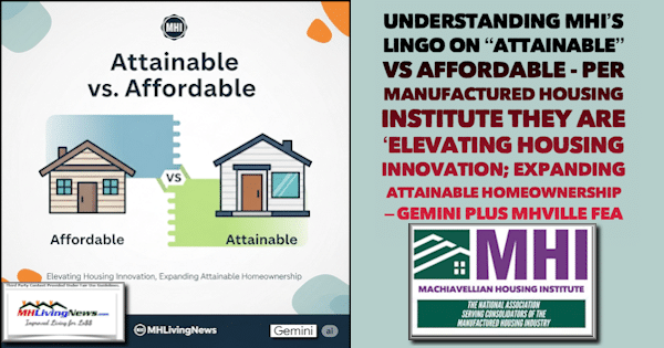 On the date and time shown, the Manufactured Housing Institute (MHI) used the term “attainable” home ownership instead of “affordable.” According to Gemini: “Attainable housing is a more flexible term that doesn’t have a precise definition within HUD guidelines.” Bold is added in the following: “It [attainable housing] typically refers to housing options that are within reach of households with incomes that are above the threshold for traditional affordable housing but still struggle with affordability in high-cost areas.” In other words, “attainable” means housing that is less “affordable” than the HUD definition for “affordable housing.”