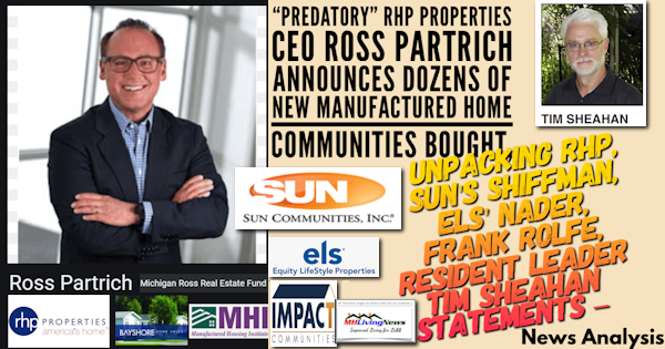 Perhaps 75 to 80 percent of manufactured home communities are owned by local owners who are often in a good working relationship with their residents. But the other 20 percent or so may fall into a different category, and that segment will be part of the subject of this report with expert analysis. “My name is Tim Sheahan and I live in a manufactured home community in San Marcos, CA, near San Diego. I have been a volunteer homeowner advocate for over 20 years serving at the local, state and national level…” Those words and what follows in this preface are from remarks prepared by Sheahan to the Federal Housing Finance Agency (FHFA) from a document available at this link here. Sheahan continued: “I have also served as a consumer representative to the HUD Manufactured Housing Consensus Committee for six years and was a delegate to the White House Conference on Aging in 2005. I have visited manufactured home communities from California to New Hampshire and Washington state to Florida. I’ve volunteered over 50,000 hours in serving resident homeowners of manufactured housing communities…” While Sheahan stressed that his remarks are “my personal views,” they are also apparently the views of an expert in several respects who has decades of lived experiences.
