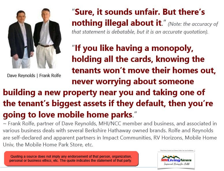 Part of that last sentence above merits restatement for emphasis. “There are many good, upstanding MH community operators…” That is similar to remarks made by Paul Bradley, with ROC USA. Bradley has also said that there are good, manufactured home community operators and more predatory ones.